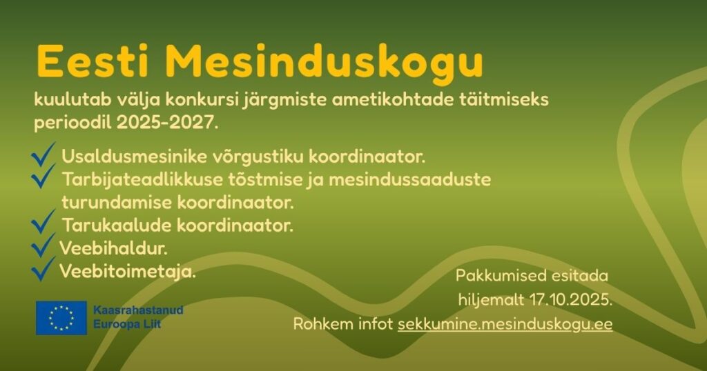 Eesti Mesinduskogu kuulutab välja konkursi mesindussektorisse sekkumise toetuse 2025–2027 koordinaatorite, veebilehe haldaja ja veebitoimetaja kohtadele järgnevalt.
