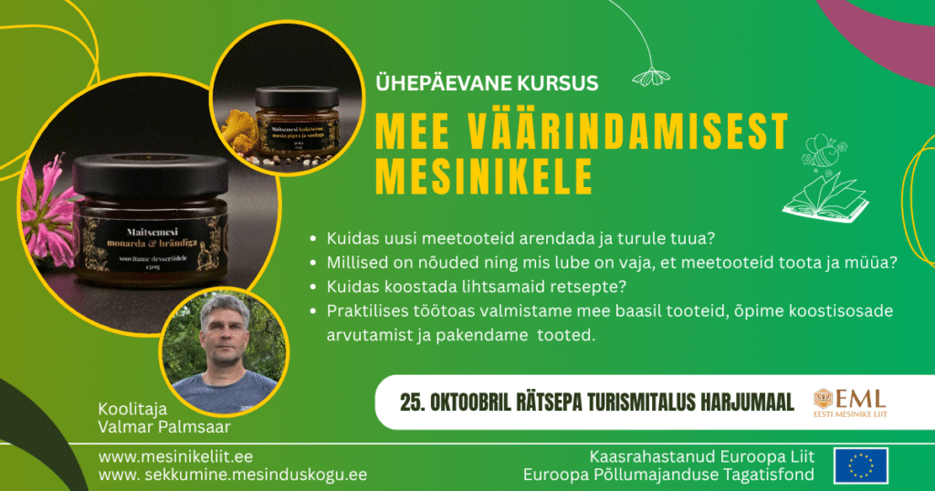 Kursus sobib nii alustavale huvilisele kui ka väiketootjale, kes soovib uusi tooteid arendada ja turule tuua.  Praktilises töötoas valmistame mee baasil erinevaid tooteid, katsetame retsepte ja õpime koostisosade arvutamist. Erilist tähelepanu pöörame meetoodete pakendamisele, räägime visuaalsest identiteedist, materjalidest ja turunduslikust mõjust. Lisaks käsitleme toidukäitlemise nõudeid, pakendimärgistust ja müügilubasid meetoodete müügiks.