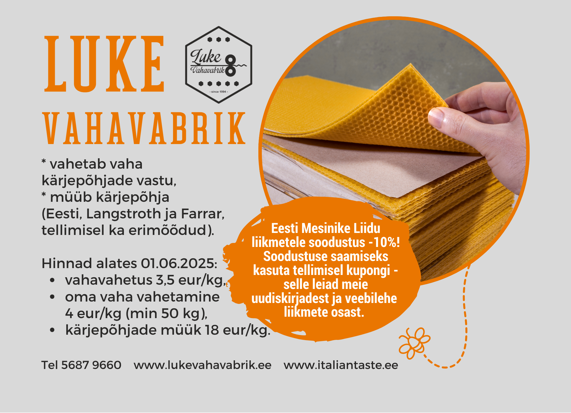 Hinnad: vahavahetus: 3,5 eur/kg, kärjepõhjade müük (Eesti, Langstroth ja Farrar): 18 eur/kg. EMLi liige - saad vaha osta või vahetada 10% soodsamalt! Selleks sisesta Luke kodulehel www.lukevahavabrik.ee enne ostu kupong, mille leiad EMLi liikmete rubriigist ja meie uudiskirjadest.